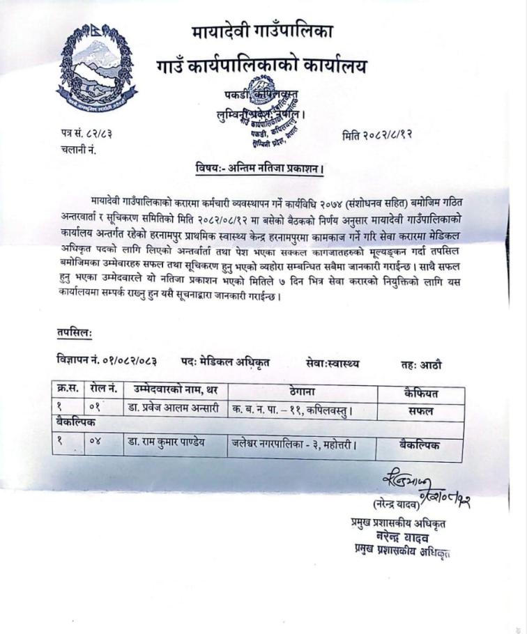 मेडिकल अधिकृत पदको अन्तिम नतिजा प्रकाशन सम्बन्धी सूचना।
