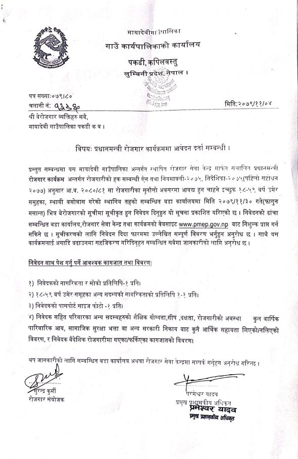 प्रधानमन्त्री रोजगार कार्यक्रममा आवेदन दर्ता गराउने सम्बन्धी सूचना ।