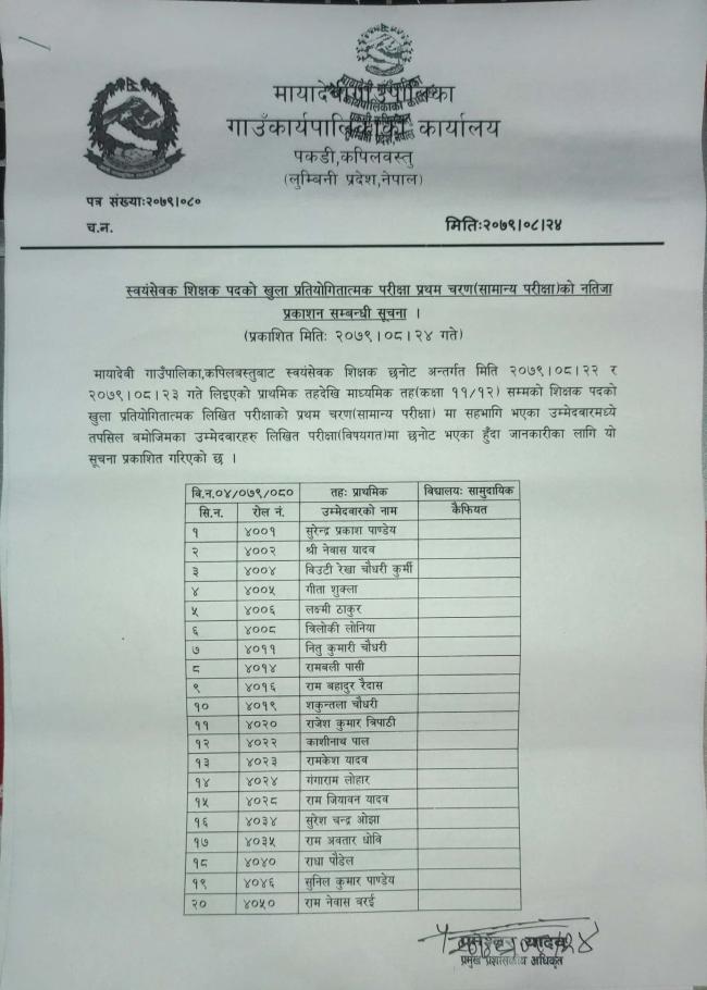 स्वयंसेवक शिक्षक पदकाे खुला प्रतियोगितात्मक परीक्षा प्रथम चरणकाे नतिजा प्रकाशन सम्बन्धी सुचना ।।