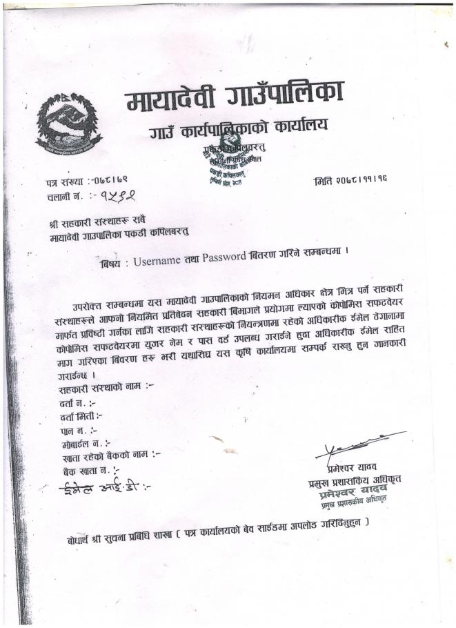 Username तथा Password उपलब्ध गराइदिने सम्बन्धमा ।